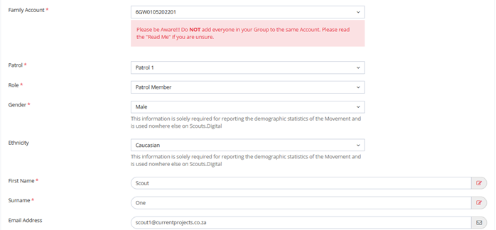 You will need to ensure that you add the scout to the same account as the relevant parent. Again – be very careful when assigning them as errors may take time to notice. You will then assign them to their patrol as well as adding in their personal information – take note that the email address is an optional extra. They will however need to have an email once they start applying for courses as it is used for communication. If the parent is iffy about them getting their own separate address you can advise them of the Gmail Additional Email Option.