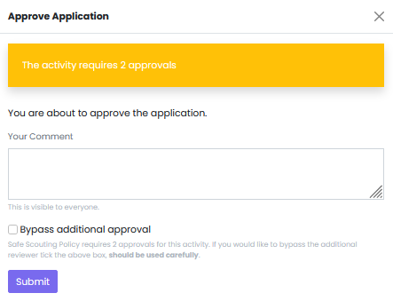 Here you are able to add comments alongside your approval. You also have the option to bypass second approval but this should not be used lightly. When ready click Submit and then it is over to the next scouter to approve.